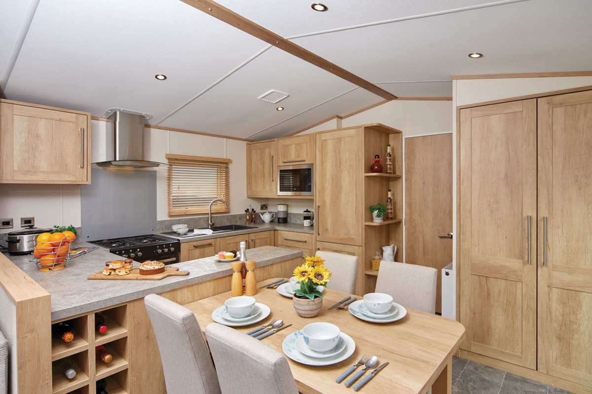 When you step into the Glenmoor Lodge, you’re transported to a country house. It comes with a wingback armchair and electric log burner fire in the lounge, a large dining table, and a wraparound kitchen.