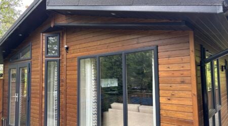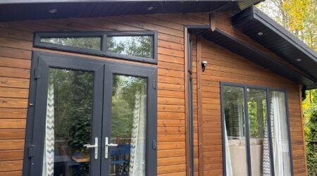 The Omar Alderney is a stunning lodge surrounded by nature at Brokerswood Holiday Park. You can take gentle walks in the woodland and breath in the fresh air.