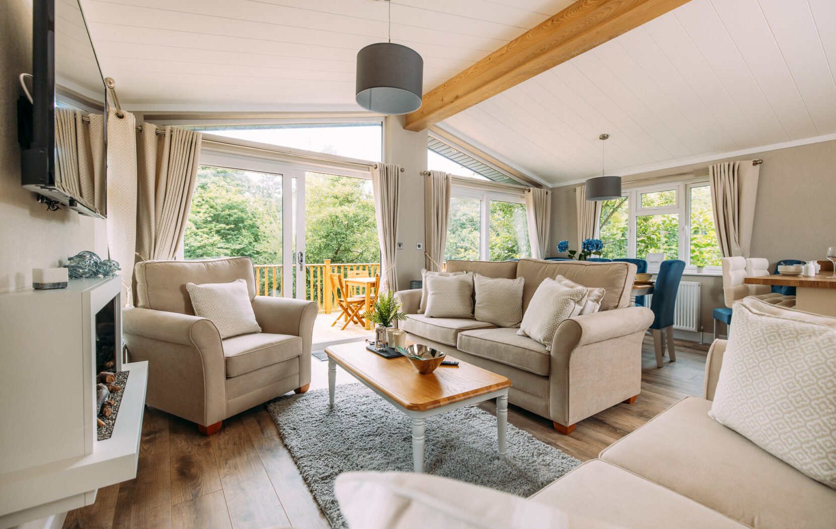 Two sets of patio doors open at the front, perfect for enjoying summer evenings and letting the fresh breeze flow through.